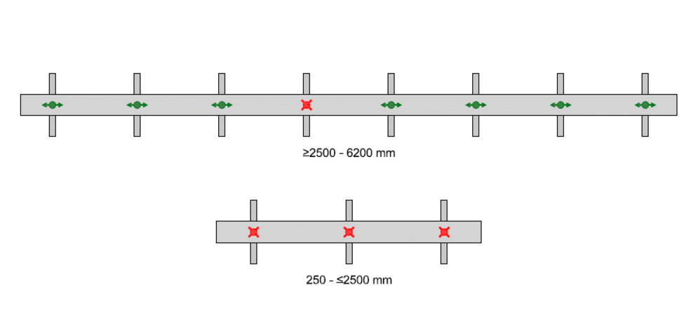 Pričvršćivanje se mora izvoditi pomoću fiksnih i kliznih točaka ovisno o duljini ekstrudiranih profila. Samo jednom postavite fiksnu točku u sredini svakog profila, bez obzira na smjer polaganja. Ostatak pričvršćenja na potkonstrukciju izvodi se u formi kliznih točaka.