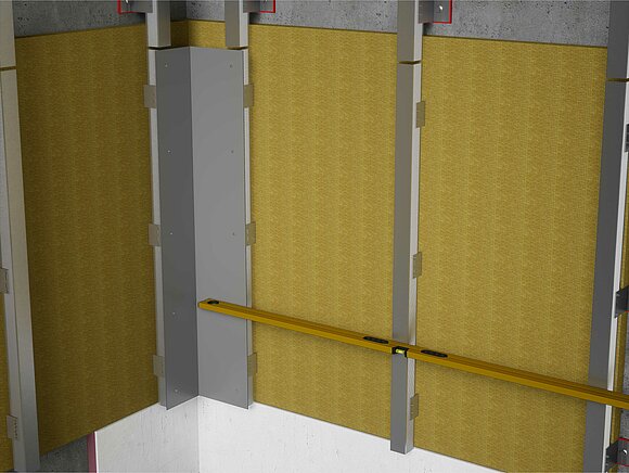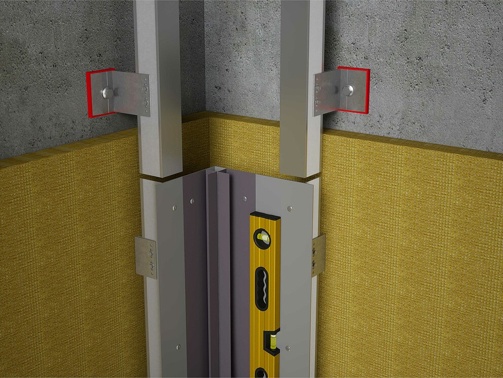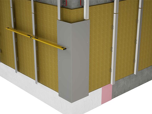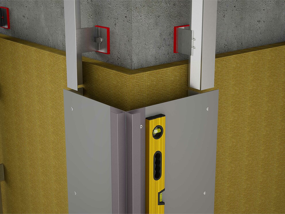 Za montažu unutarnjeg ili vanjskog kuta, pripremite potkonstrukciju za horizontalno polaganje profila. Za montažu unutarnjih ili vanjskih kutnih profila potrebno je prvo spojiti vertikalnu potkonstrukciju učvršćivanjem kutnog držača od aluminijskog lima debljine 2 mm ili pocinčanog čeličnog lima (1 mm). Prilikom montaže potkonstrukcije potrebno je pripaziti da su nosivi profili pozicionirani prema unutra po debljini materijala kutnog držača kako bi se osigurala poravnatost potkonstrukcije.