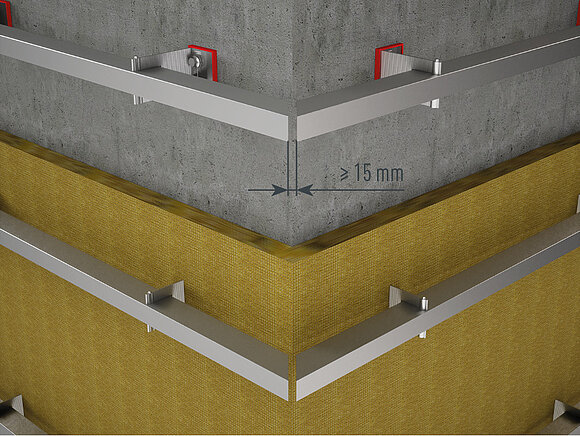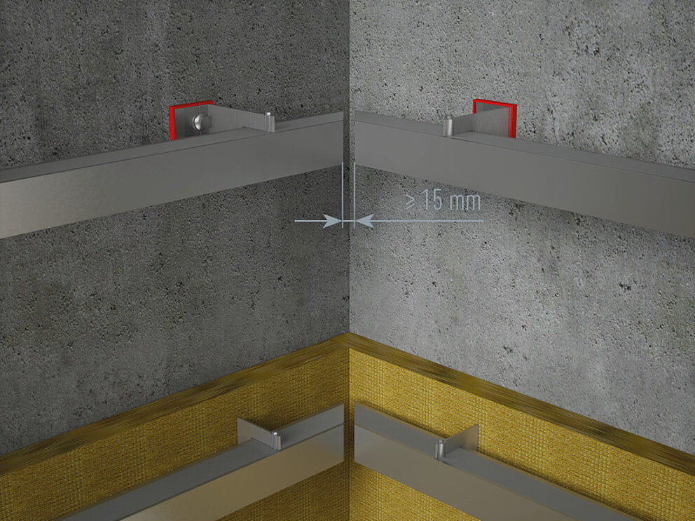 Prilikom montaže unutarnjih ili vanjskih kutnih profila pazite da se nosivi profili potkonstrukcije ne sudaraju u kutnom području. Održavajte udaljenost od najmanje 15 mm. Kod pričvršćenja treba pripaziti na montažu koja dopušta istezanje, s jasnim definiranjem fiksnih i kliznih točaka.