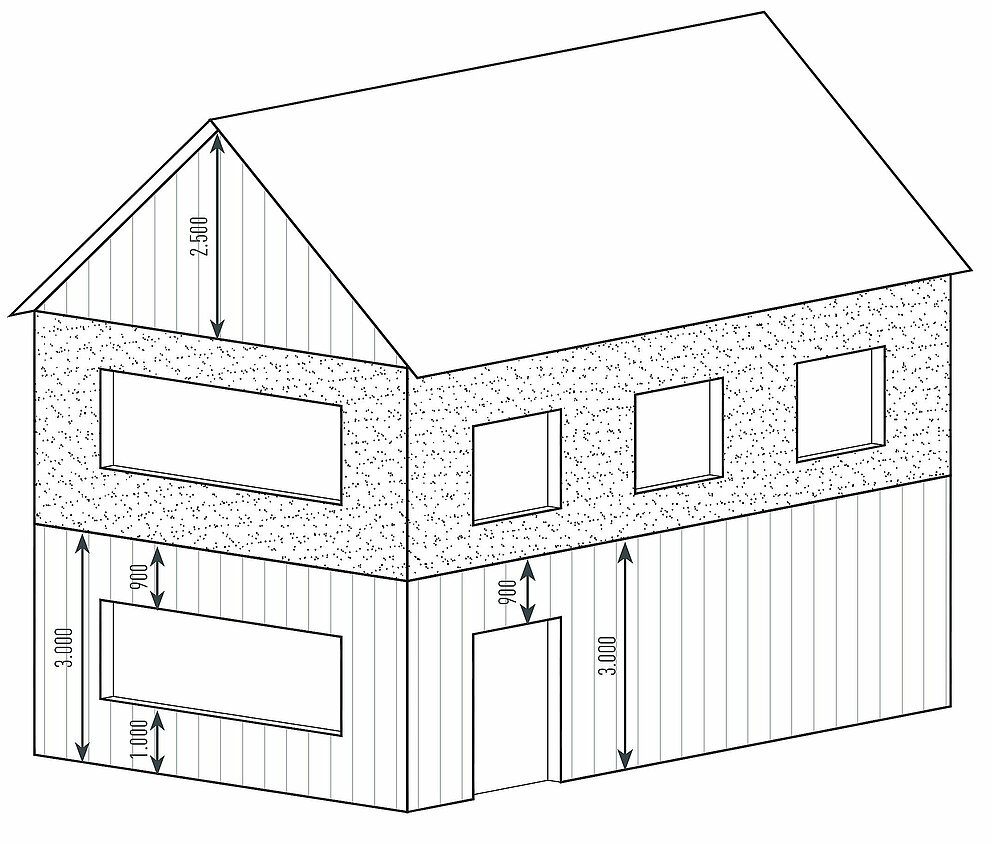 Izreske kao što su npr. prozori ili vrata, koji djelomično strše u fasadnu kazetu, treba zanemariti pri definiranju materijala i prilagoditi ih na licu mjesta (površine označene crvenom bojom).