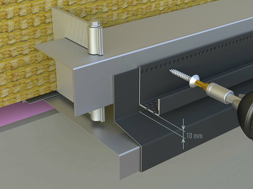 Nakon izrade potkonstrukcije započnite s montažom utične lajsne, pokrivne trake, perforiranog lima i okapnog lima. Spojevi okapnog lima izvode se preklapajuće i lijepe se. (Skriveni) donji okapni lim se izrezuje tako da se gornji okapni lim može montirati.