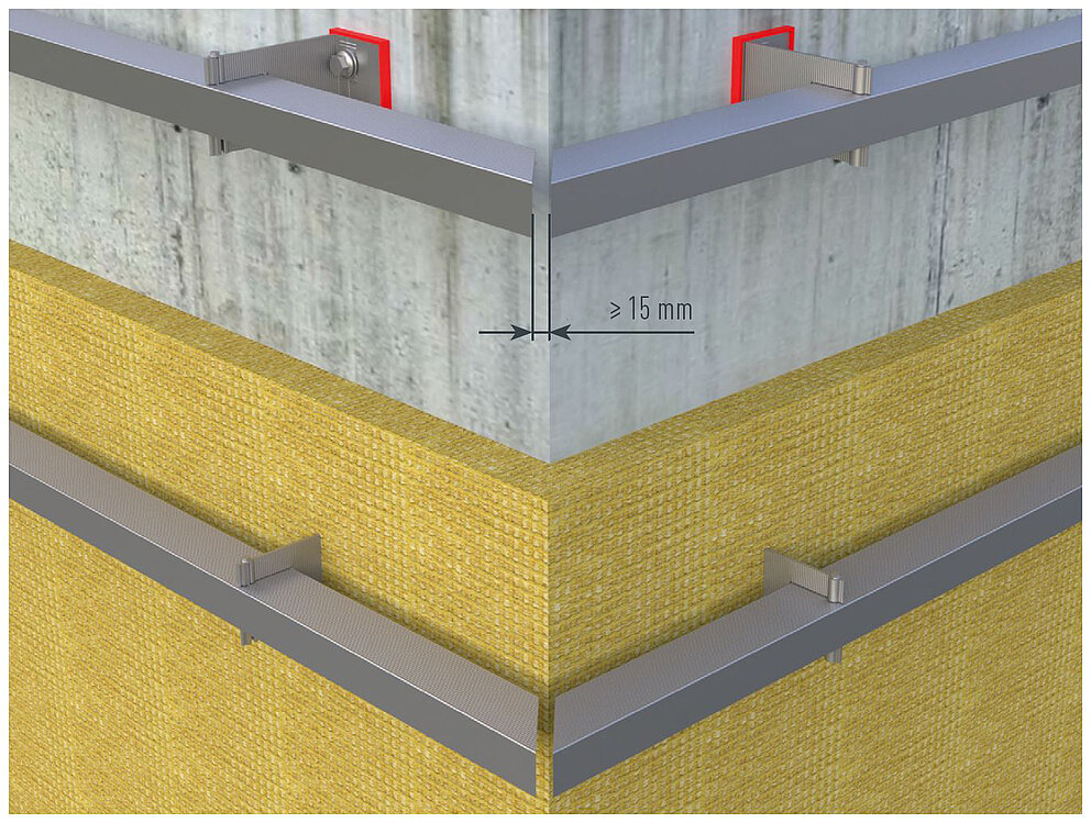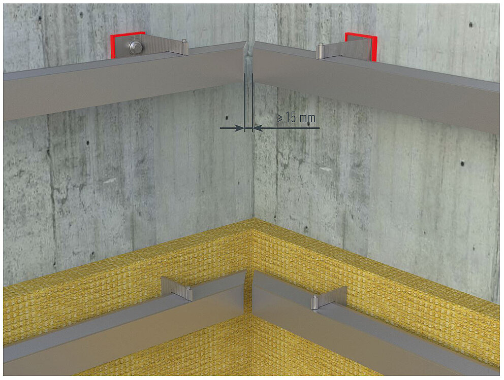 Prilikom montaže unutarnjih ili vanjskih kutnih profila pazite da se nosivi profili potkonstrukcije ne sudaraju u kutnom području. Održavajte udaljenost od najmanje 15 mm. Kod pričvršćenja treba pripaziti na montažu koja dopušta istezanje, s jasnim definiranjem fiksnih i kliznih točaka.