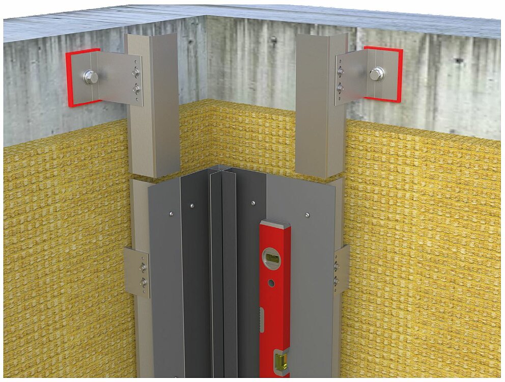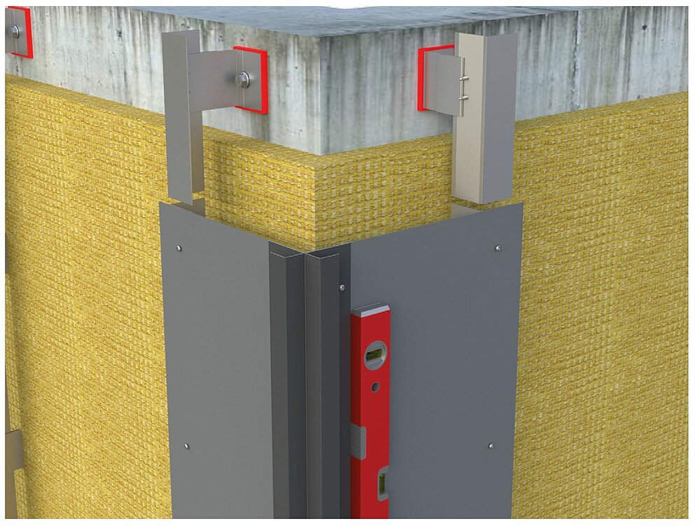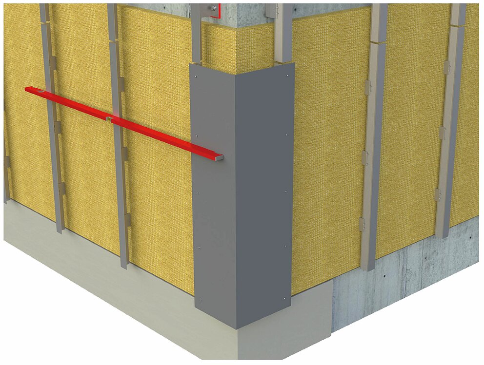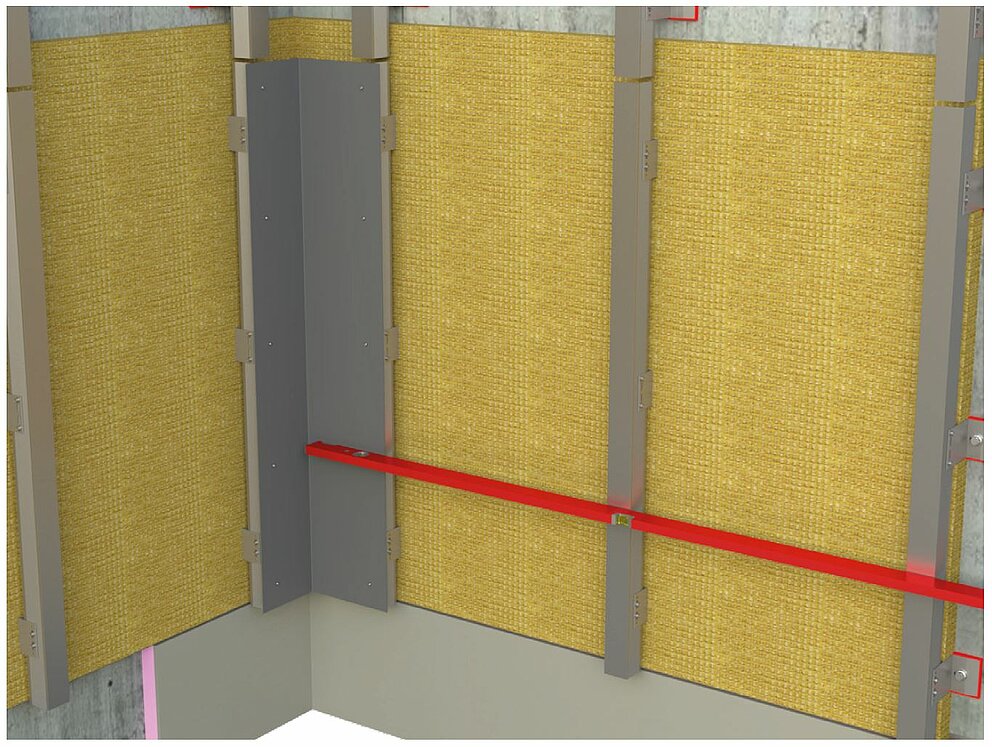 Za montažu unutarnjeg ili vanjskog kuta, pripremite potkonstrukciju za horizontalno polaganje profila. Za montažu unutarnjih ili vanjskih kutnih profila potrebno je prvo spojiti vertikalnu potkonstrukciju učvršćivanjem kutnog držača od aluminijskog lima debljine 2 mm ili pocinčanog čeličnog lima (1 mm). Prilikom montaže potkonstrukcije potrebno je pripaziti da su nosivi profili pozicionirani prema unutra po debljini materijala kutnog držača kako bi se osigurala poravnatost potkonstrukcije.