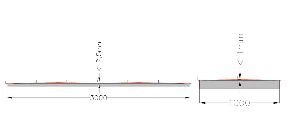 Tolerancija potkonstrukcije ograničena je na dimenzije šava od 2,5 mm pri razmaku mjernih točaka od 3.000 mm odn. 1 mm pri 1.000 mm.
