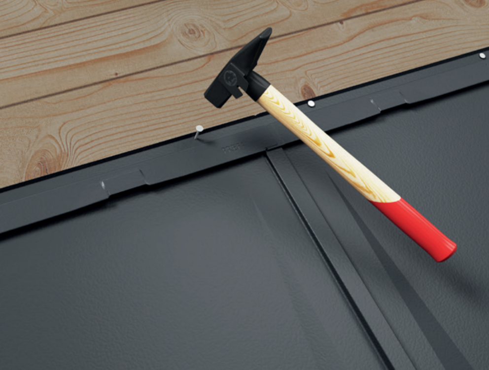 Namjestite krovnu ploču R.16 i umetnite je u falceve. Lagano dodatno udarite donji rub ploče drškom čekića.