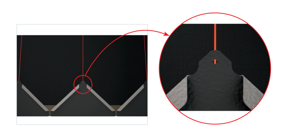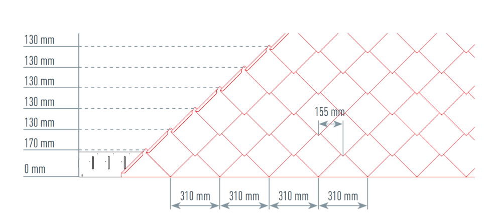 Za pomoć pri postavljanju PREFA zidnih rombova 20 × 20, preporučuje se izrada rastera vertikalnim označavanjem linija konopcem u razmaku od 310 mm (oznake na početnoj traci služe kao smjernica). Kako bi se precizno pridržavala mjera vezivanja u svakom redu, po potrebi se može označiti polovica mjere vezivanja i provjeravati u redovitim intervalima. Poravnajte početne ploče s urezima (na gornjem rubu početnih ploča) na vertikalnim oznakama linija konopcem (vidi sliku u nastavku). Oznake na početnoj traci nisu mjerodavne za zidni romb 20 × 20. Treba paziti da područje za bočno savijanje ruba naviše (npr. bočni završetak odnosno kut zgrade) ne bude u sredini zidnih rombova 20 × 20 (obratite pozornost na simetriju površine fasade).