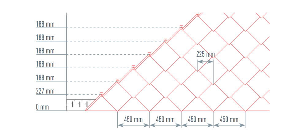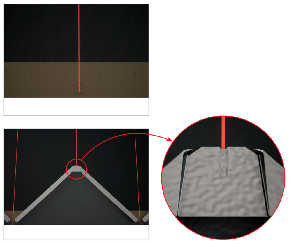 Za pomoć pri postavljanju PREFA zidnih rombova 29 × 29, preporučuje se izrada rastera vertikalnim označavanjem linija konopcem u razmaku od 450 mm (oznake na početnoj traci služe kao smjernica). Kako bi se precizno pridržavala mjera vezivanja u svakom redu, po potrebi se može označiti polovica mjere vezivanja i provjeravati u redovitim intervalima. Poravnajte početne ploče s urezima (na gornjem rubu početnih ploča) na vertikalnim oznakama linija konopcem (vidi sliku u nastavku). Treba paziti da područje za bočno savijanje ruba naviše (npr. bočni završetak odnosno kut zgrade) ne bude u sredini zidnih rombova 29 × 29 (obratite pozornost na simetriju površine fasade).