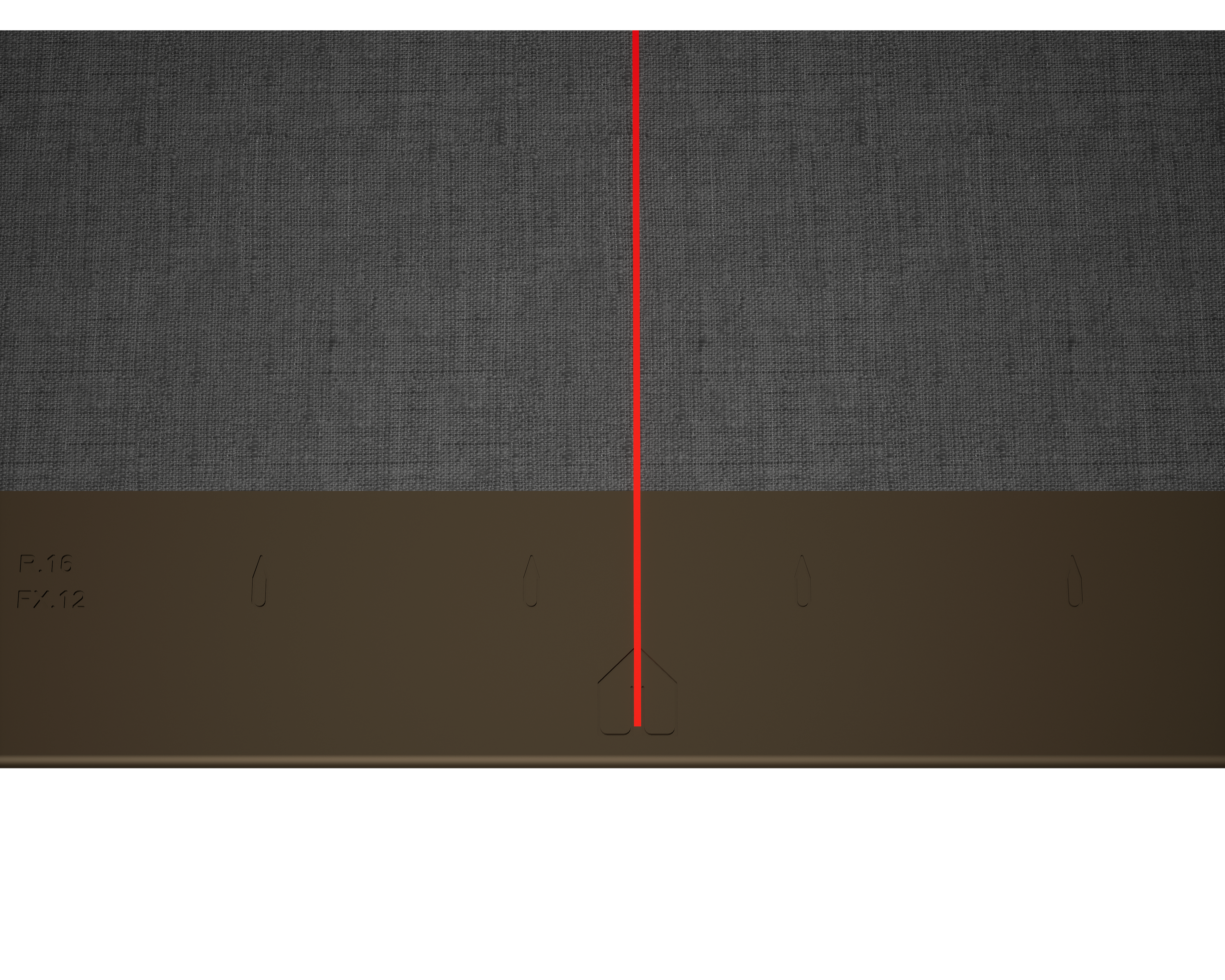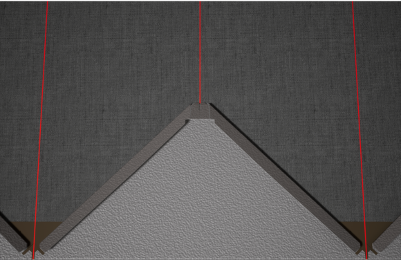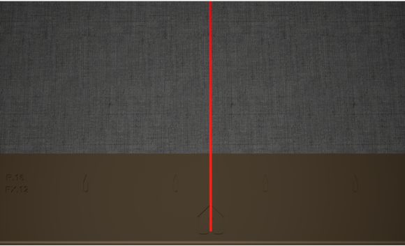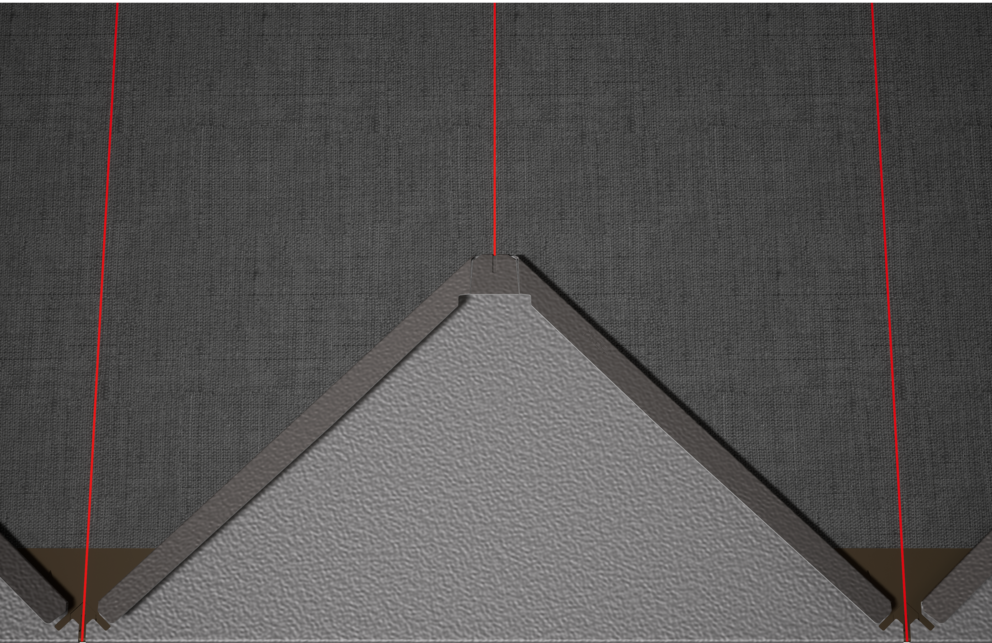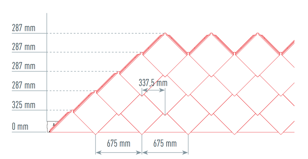 Za pomoć pri postavljanju PREFA zidnih rombova 44×44, preporučuje se izrada rastera vertikalnim označavanjem linija konopcem u razmaku od 675 mm (oznake na početnoj traci služe kao smjernica). Kako bi se precizno pridržavala mjera vezivanja u svakom redu, po potrebi se može označiti polovica mjere vezivanja i provjeravati u redovitim intervalima. Poravnajte početne ploče s urezima (na gornjem rubu početnih ploča) na vertikalnim oznakama linija konopcem (vidi sliku u nastavku). Treba paziti da područje za bočno savijanje ruba naviše (npr. bočni završetak odnosno kut zgrade) ne bude u sredini zidnih rombova 44×44 (obratite pozornost na simetriju površine fasade).