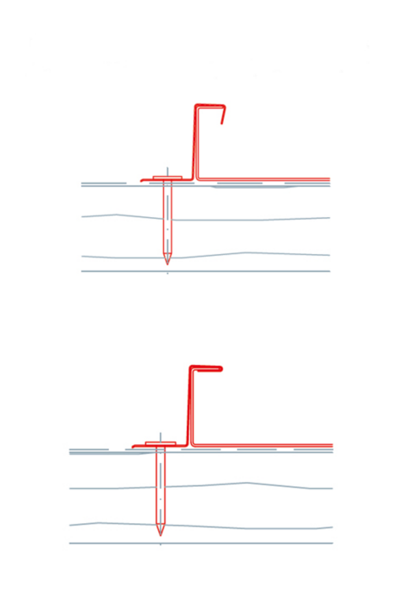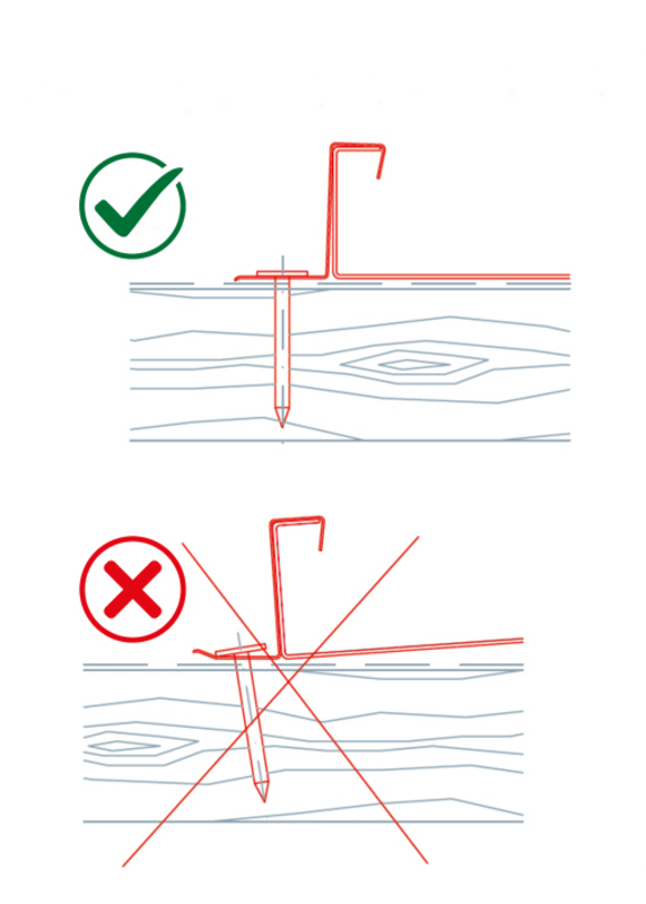 Prilikom pričvršćenja PREFA nehrđajućeg kutnog stojećeg falca i kutnog kliznog učvršćivača potrebno je pripaziti da su čavli za krovnu ljepenku za pričvršćenje dovoljno duboko umetnuti i ne vire preko visine utora, kako bi se izbjegla mjesta nagnječenja i abrazija na gotovom pokrovu. Za pričvršćenje svakog PREFA kutnog stojećeg falca potrebna su dva učvršćivača. PREFA nehrđajuća čavla za krovnu ljepenku. Za pričvršćenje svakog PREFA kutnog kliznog učvršćivača potrebno je upotrijebiti 3 PREFA nehrđajuća čavla za krovnu ljepenku.
