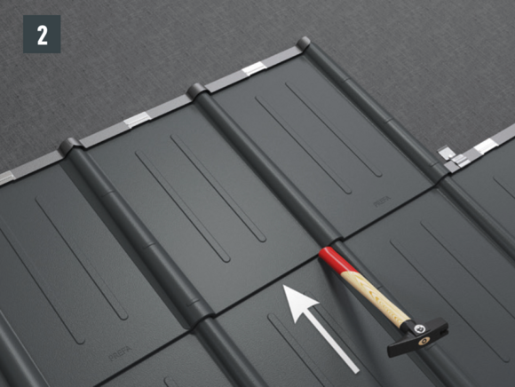 Utisnite ploču u spojni falc. Lagano dodatno udarite donji rub ploče drškom čekića (slika 2).