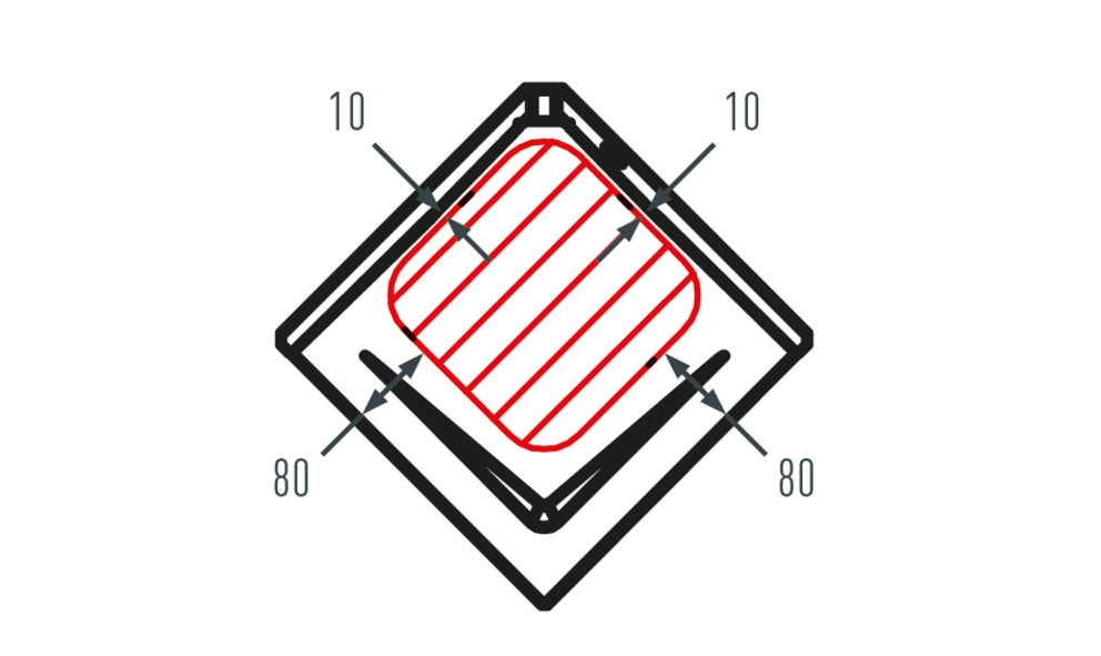 Pri montaži krovnog dodatnog pribora pazite na dopušteno područje montaže na krovnim rombovima 29 × 29. Slika u nastavku pokazuje područje montaže za dodatni pribor na stopama. Za drugi dodatni pribor mogu biti definirana različita područja montaže.