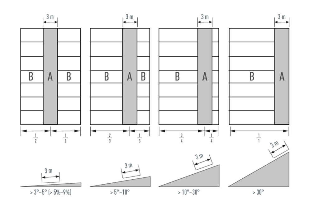 Dužina područja fiksnog učvršćivača treba iznositi 3 metra. Načelno se pozicija fiksnog učvršćivača bira u ovisnosti od nagiba krova – vidi sliku u nastavku i pripadajuću tablicu. Prodori ili oblik krova mogu utjecati na poziciju fiksnog učvršćivača. Područja s različitim pozicijama fiksnog učvršćivača potrebno je odvojiti pregradnim letvama.