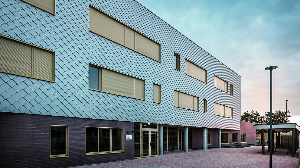 Rješenje je pronađeno u kombinaciji dvaju materijala: smećkasti klinker u donjem dijelu i srebrno sjajna aluminijska fasada u gornjim katovima. Ova podjela daje zgradi određenu eleganciju, a istovremeno se odlikuje čvrstoćom i prikladnošću za svakodnevnu upotrebu. Otprilike 15.000 PREFA zidnih rombova dimenzija 29 × 29 u srebrno-metalik boji tvore vanjski omotač. To je više od 1.375 četvornih metara aluminija, koji su pažljivo planirani, proizvedeni i montirani. Promjenjivi metal stvara živu površinu koja, ovisno o svjetlu, sjaji u različitim nijansama neba.