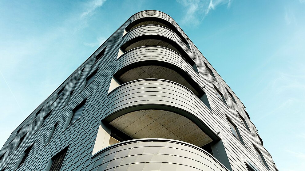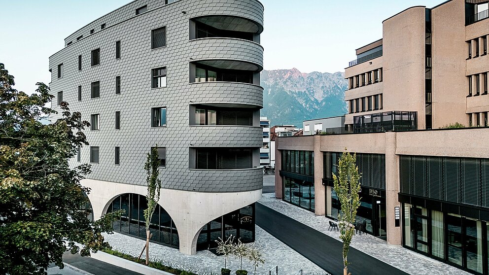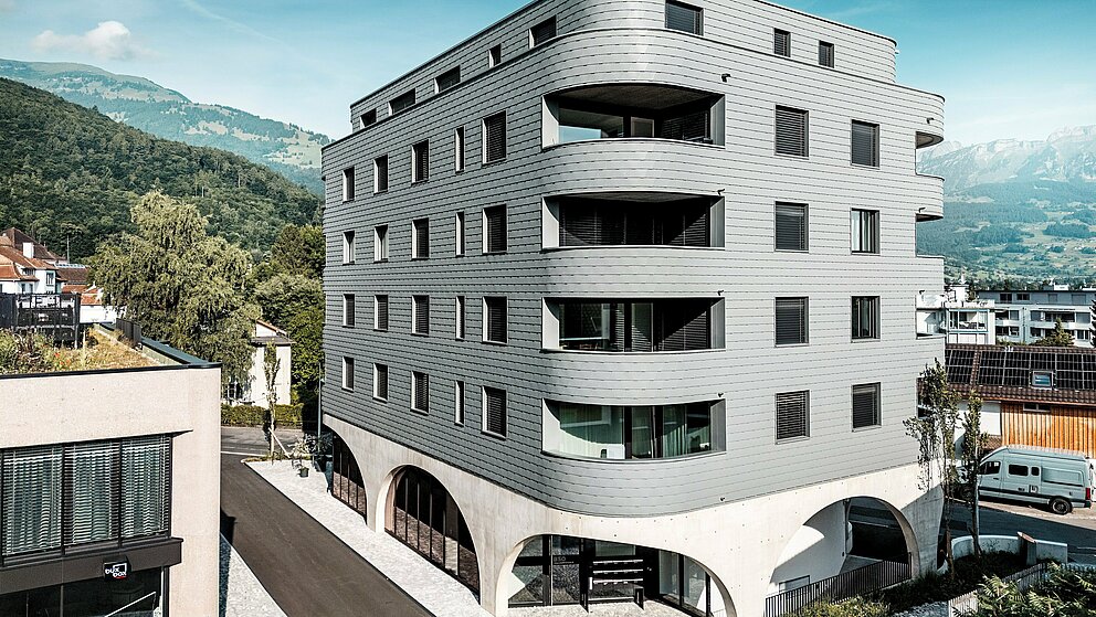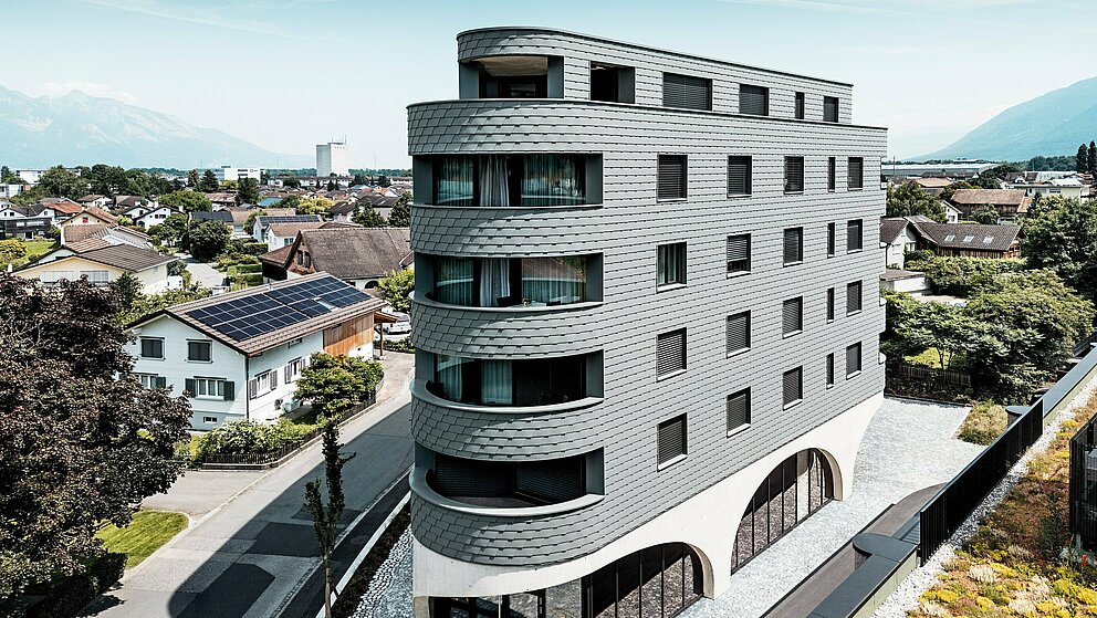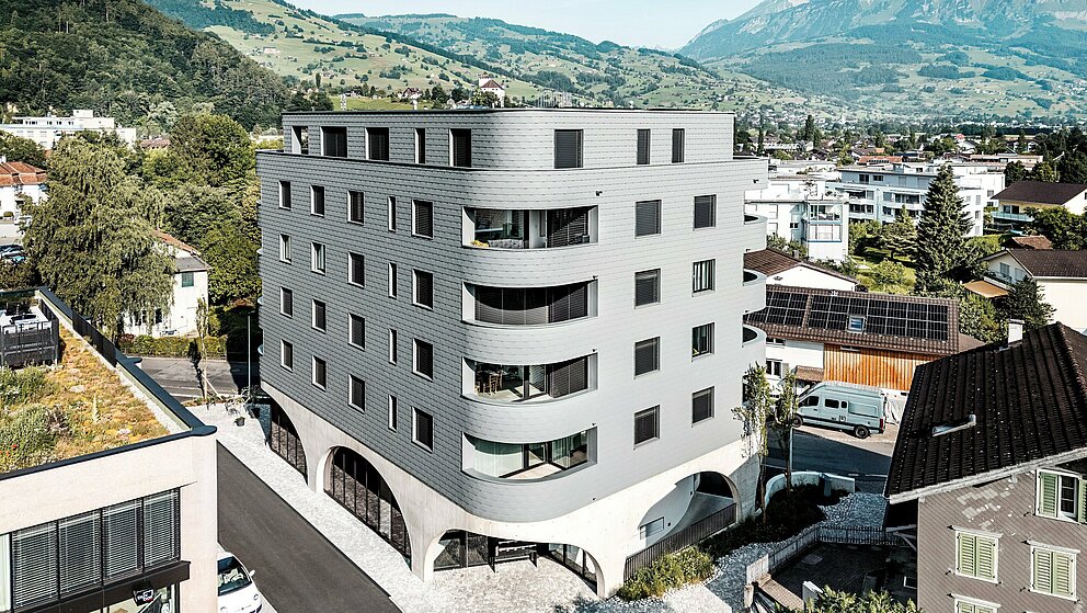 Novogradnja kombinira čvrstu masivnu konstrukciju s iznimnim vizualnim dojmom. Dijelom zbog zgrade bez kutova u trokutastom obliku, a dijelom zbog njene „ljuskaste reptilske kože“ od sitnih PREFA zidnih šindra u P.10 svijetlosivoj boji, koja ujednačeno obavija zgradu i čini je pravim vizualnim naglaskom. Još bolja odluka, jer zahvaljujući formatu šindra se mogu postaviti i na uskim radijusima, što omogućuje zaobljene kutove. „Neposredno iza naše zgrade počinju tradicionalne švicarske obiteljske kuće, a one su kod nas obložene šindrom“, objašnjava Keller svoju kreativnu odluku u dizajnu.