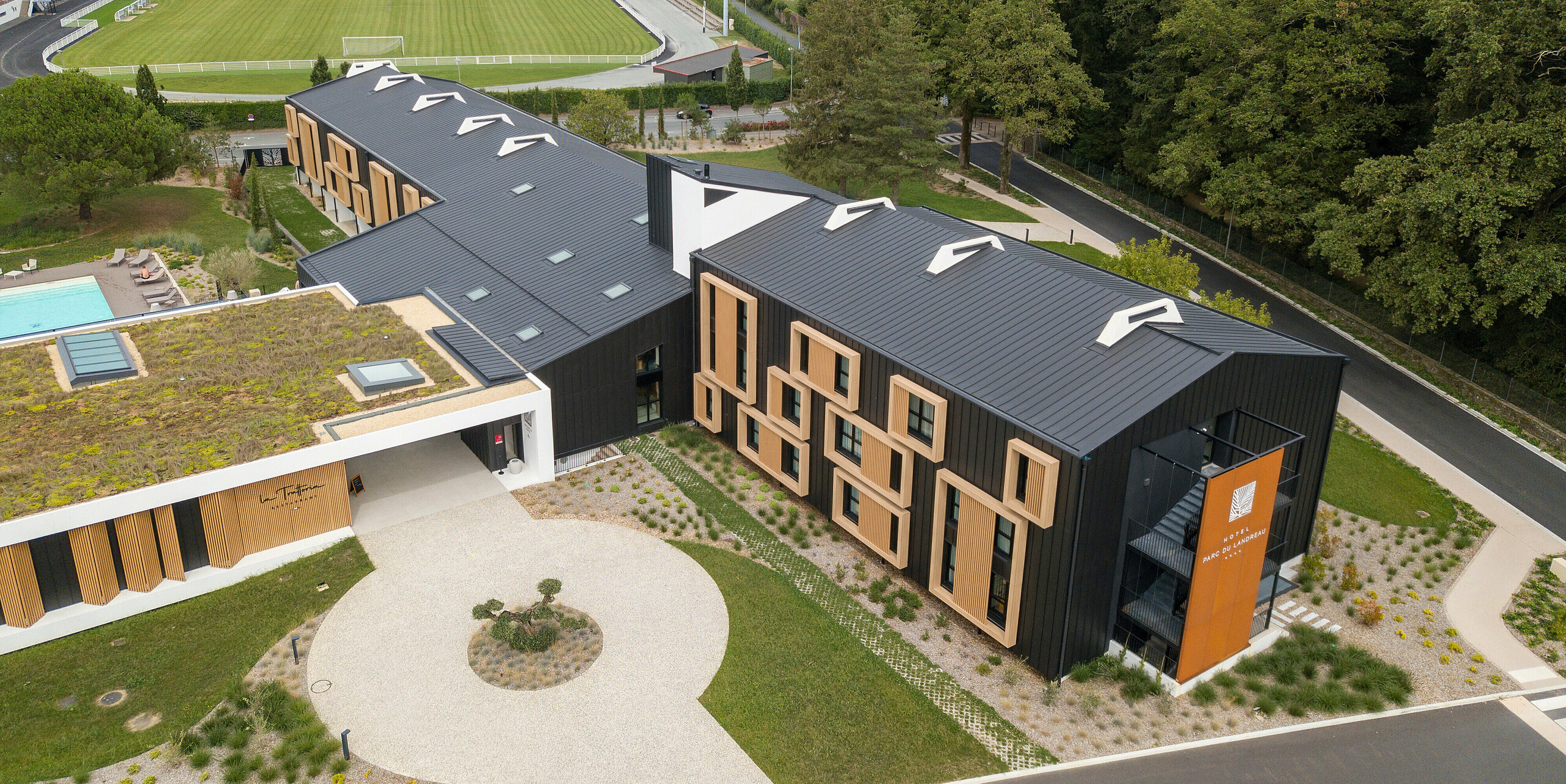 Hotel Parc du Landreau u francuskom mjestu Les Herbiers plijeni poglede zahvaljujući svojoj modernoj arhitekturi. Kombinacija aluminija i drva upotrijebljena za obloge prozora naglašava pristup oblikovanju i stvara primamljivu atmosferu.