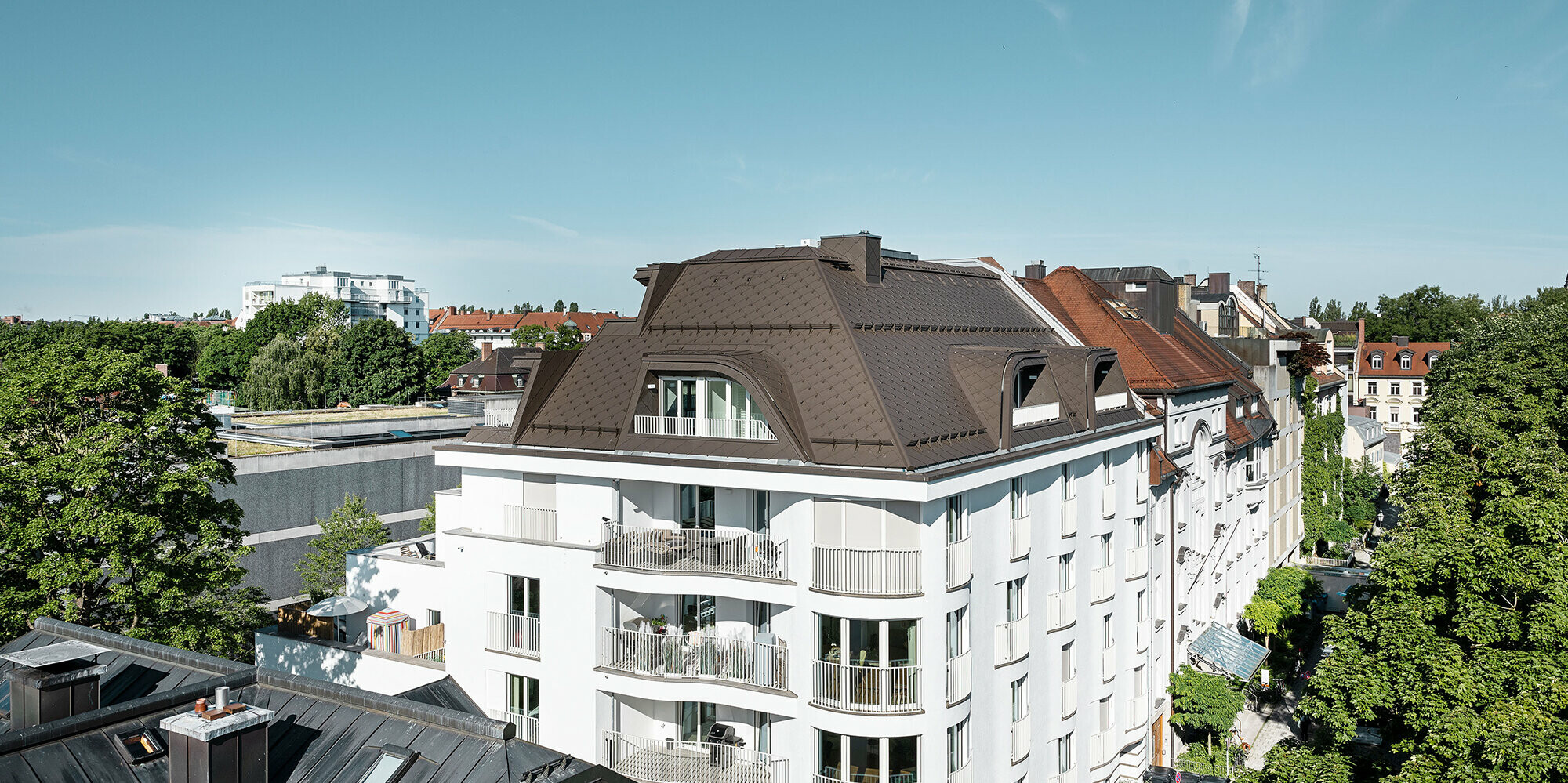 Krov je kruna kuće, a to mišljenje dijele i stanari kuće s više stanova u Münchenu. No u gradu koji je tako gusto izgrađen životni prostor je dragocjen i treba ga što je moguće bolje iskoristiti. Kako se dizajn poslijeratne modernističke zgrade ne bi previše mijenjao, investitor se odlučio za krovne rombove 44 x 44 u P.10 smeđoj boji.