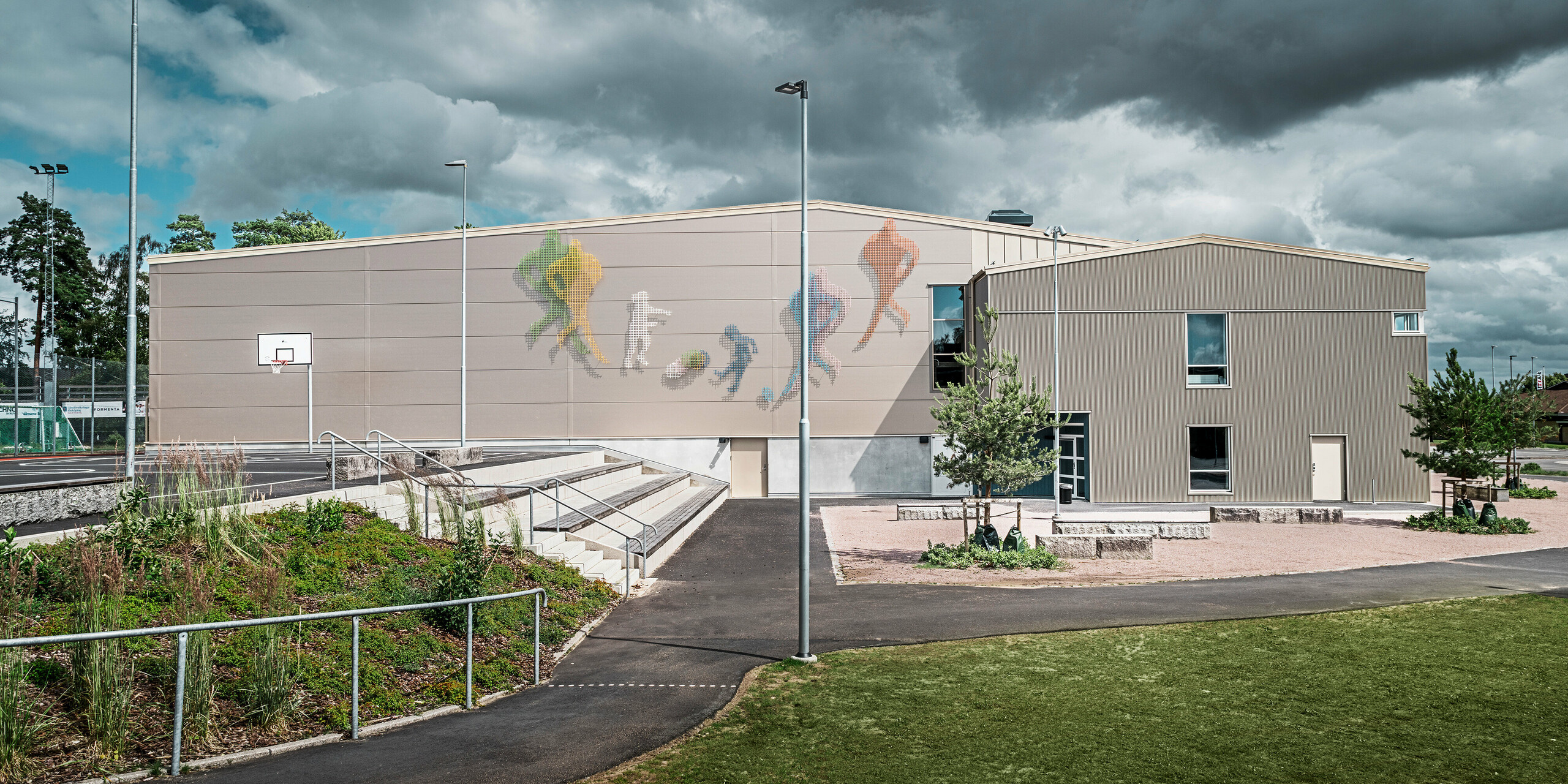Tri vanjska zida umjetnički su dizajnirana i prikazuju figure velikih dimenzija u različitim sportskim aktivnostima – riječ je o kreativnoj posveti sportskom duhu arene.