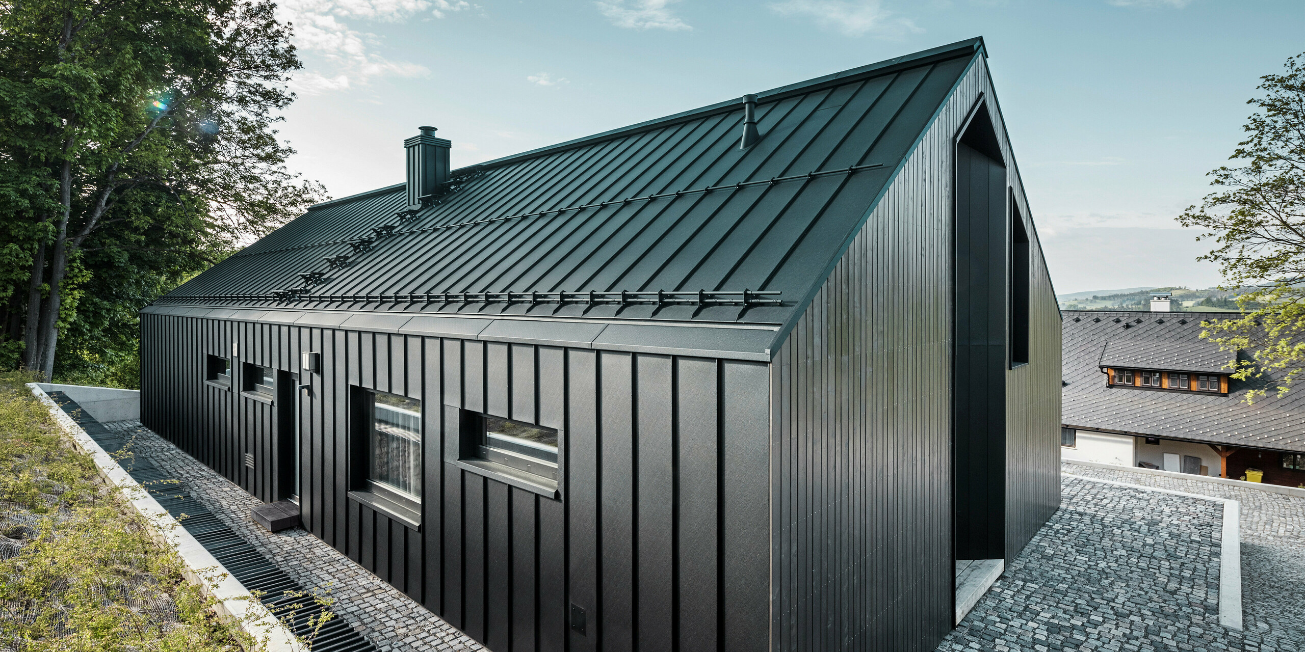 Stražnja strana i krov zgrade potpuno su prekriveni dugovječnom i robusnom aluminijskom ovojnicom od sustava PREFALZ u P.10 crnoj boji. Kombinacija tamnih drvenih ploča i crnih aluminijskih elemenata uistinu privlači poglede u ovom prirodnom okruženju.
